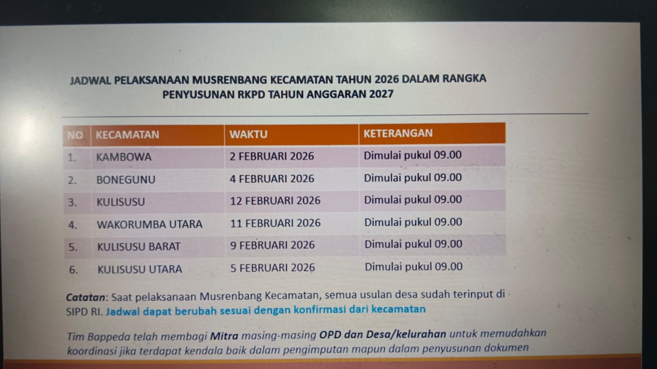 Berikut jadwal pelaksanaan Musrenbang kecamatan Tahun 2026, Dalam Rangka Penyusunan RKPD Tahun Anggaran 2027