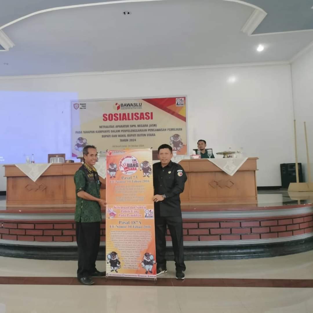 SEPUTARSULTRA.COM-Dalam rangka mewujudkan pemilihan Kepala Daerah yang demokratis dan berintegritas, Badan Pengawas Pemilihan Umum(Bawaslu) Kabupaten Buton Utara menggelar sosialisasi Netralitas ASN dalam Pilkada serentak Tahun 2024 yang diikuti ASN Lingkup Pemerintah Kabupaten Buton Utara bertempat di HB Beach Hotel Kulisusu, Kamis, 24 Oktober 2024.