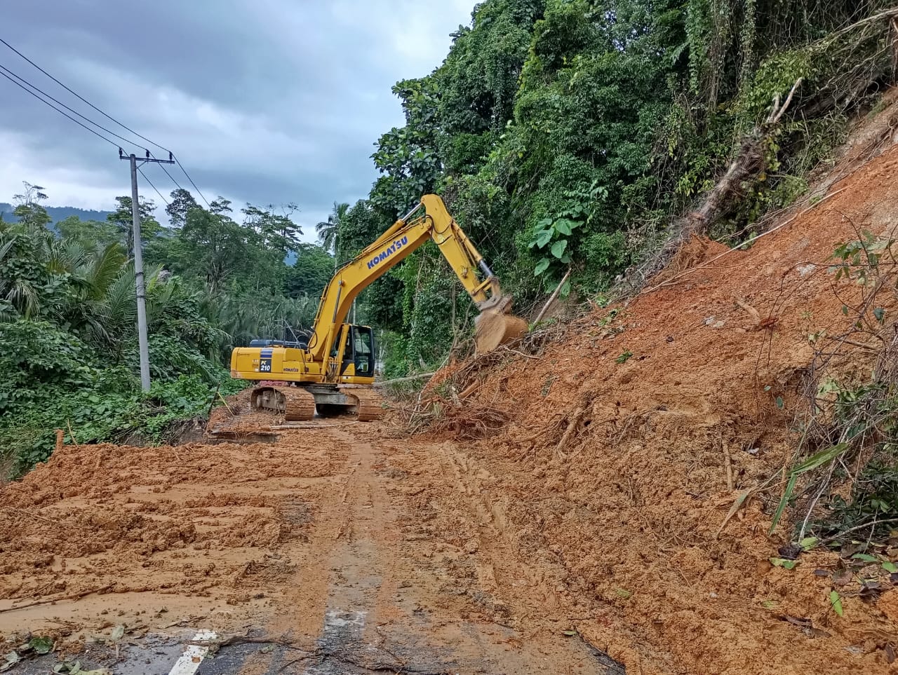 Alat berat sudah diturunkan sejak longsor terjadi, material longsor berupa tanah dan batu menimbun bahu jalan, sehingga proses memakan sedikit waktu.